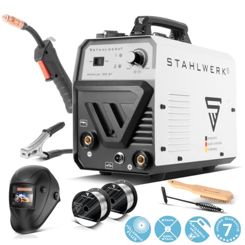 STAHLWERK Mini FLUX 120 ST volledig uitgerust lasapparaat met gevulde draad met synergische draadaanvoer voor 0,6|0,8|0,9|1,0 mm lasdraad, compacte inverter met echt 120A laswerk zonder beschermgas